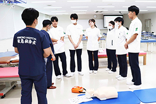 座学の後、グループに分かれてのモデル人形を用いた演習では、実際の現場で複数の人の協力が必要であるため、講師の指導のもと学生は使用する場面を想定したそれぞれの役割を持ち回りで体験しました。いつ遭遇するか分からない非常事態にも、ためらわず救命行動に移せるよう、自分が命を救えるかもしれないという自信と使命感を持った医療人を目指し、より一層意識を高めることが期待されます。