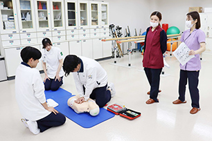 理学療法学科及び作業療法学科3年生が、授業の一環として救急救命について学びました。講師として、法人母体の姫野病院から救命士、看護師、理学療法士等で編成される急変対策委員会の方々に来校いただき、BLS講習を実施いただきました。このBLS講習では、突然の心肺停止や窒息に遭遇した際、救急隊や医師が到着するまでの間に行う一次救命処置の知識と技術を学び、心肺蘇生法やAEDの基本的な使い方を習得します。
