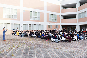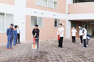 そして、全学生・教職員が参加した避難訓練では、実際の火災発生を想定した初期消火や通報、そして安全かつ迅速な避難に向けた訓練を行い、避難後には八女消防本部の方より講評をいただきました。最後には、教職員が初期消火や避難誘導などについて再確認し、災害時の対応力向上を図りました。今後も、学生の安全を最優先に、防災意識の定着と環境整備に取り組んでまいります。