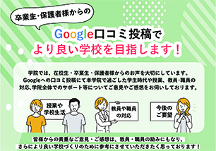 本学院では、在校生・卒業生・保護者様からのお声を大切にしています。Googleへの口コミ投稿にて本学院で過ごした学生時代や授業、教員・職員の対応、学院全体でのサポート等についてご意見やご感想をお伺いしております。